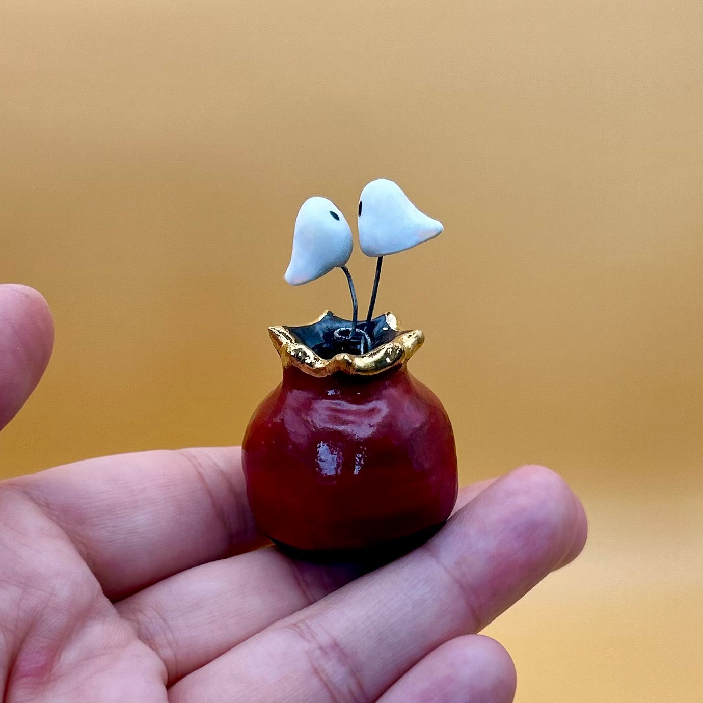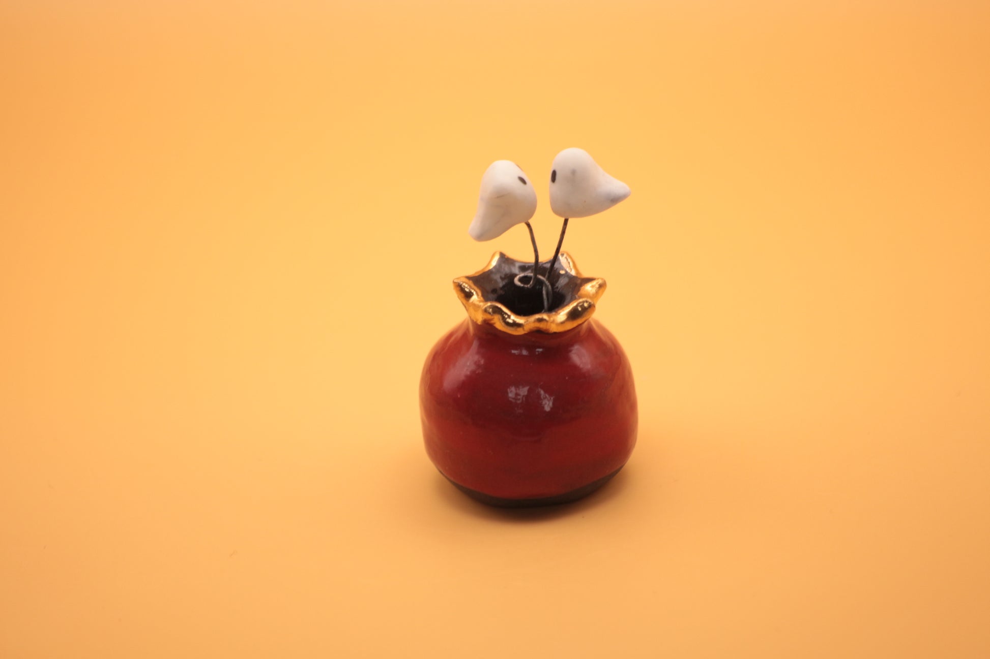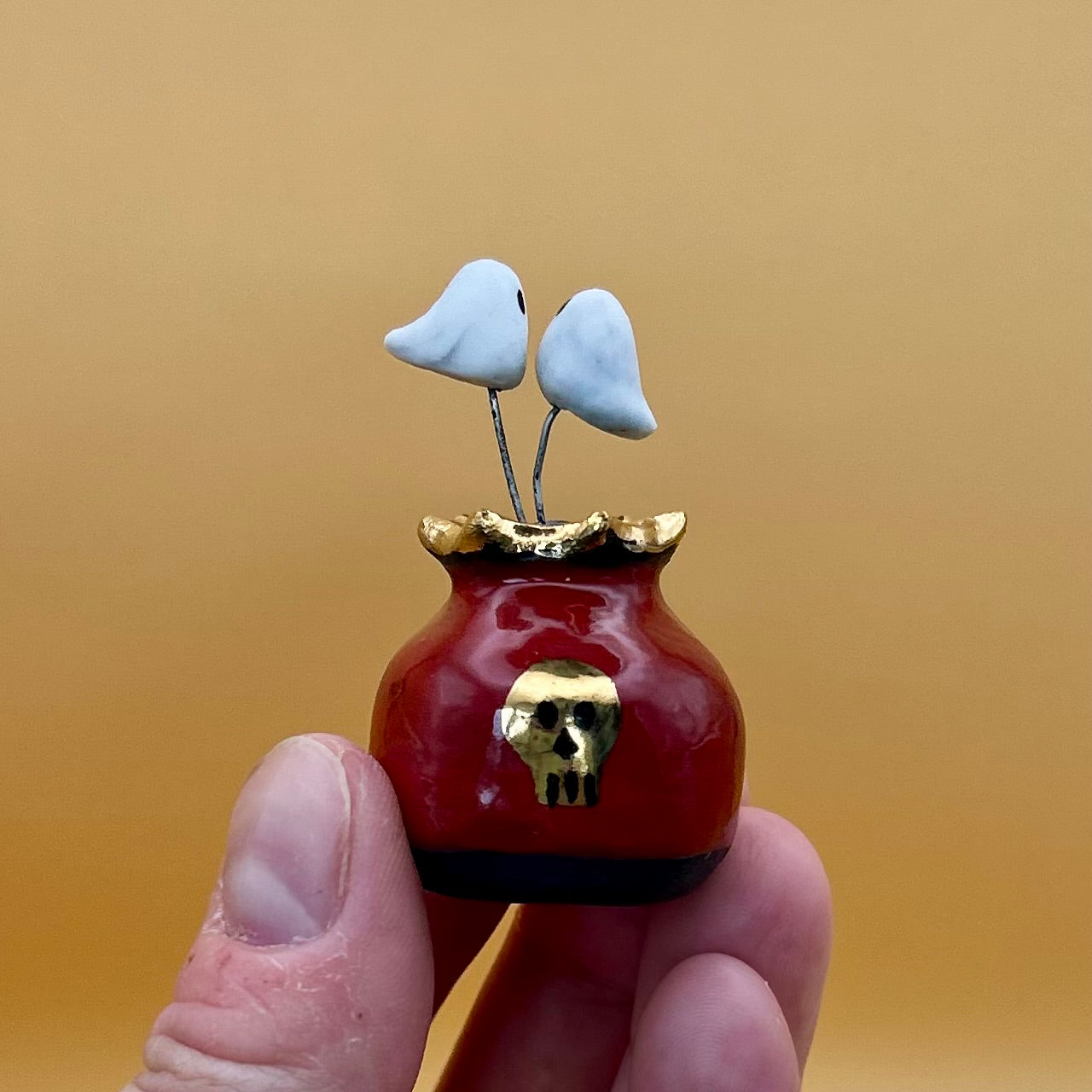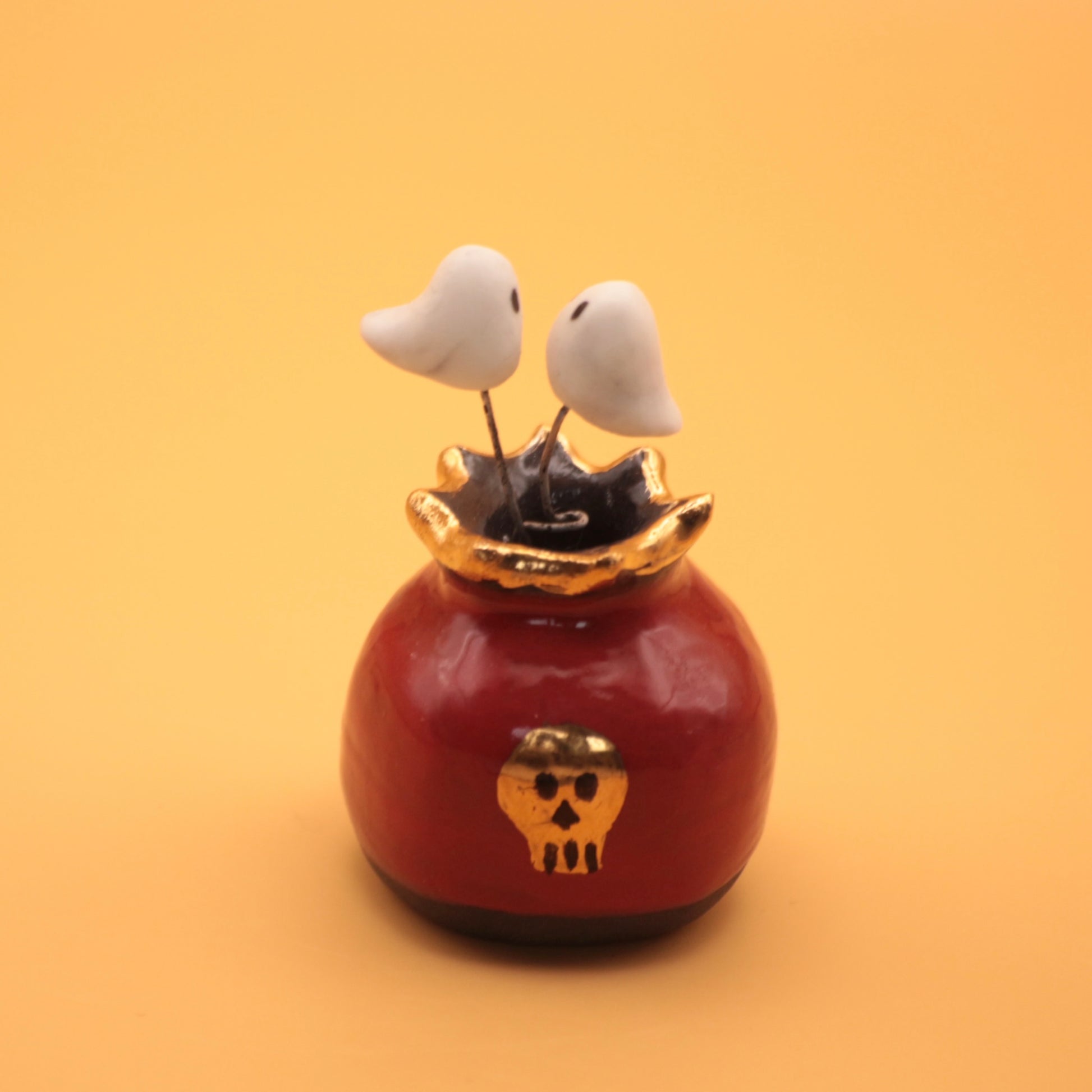Ceramic ghost vase with gold skull adornment, hosting 2 loving ghosts. Wheel-thrown and hand-sculpted from premium quality porcelain clay.
